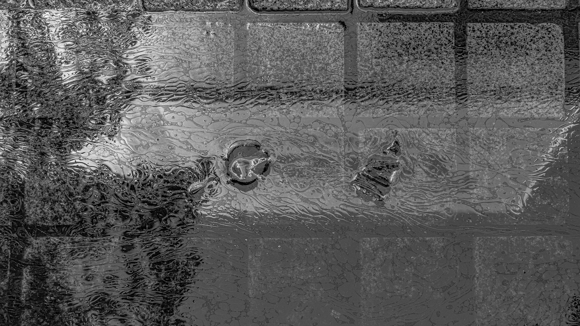 As I try to focus, the thickness and movement of the oil break up the image, and my gaze slips downward toward the bottom of the puddle. There, the straight lines of tile come into view beneath the water, overlapping with the reflections above.
