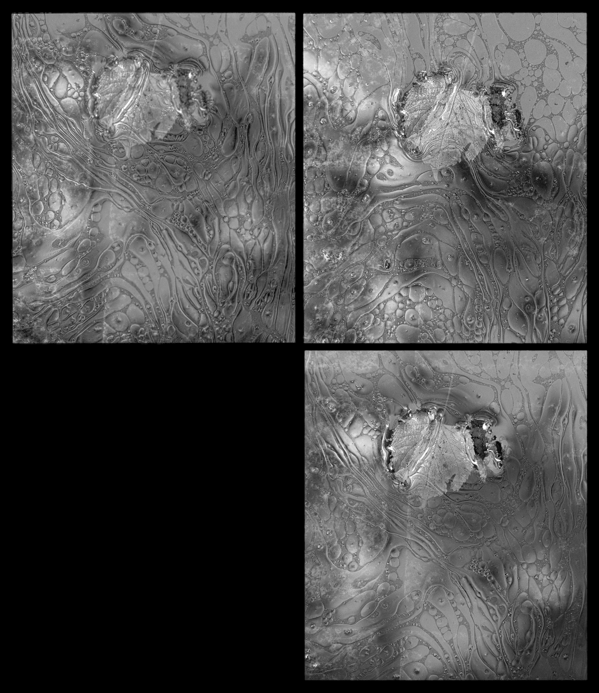 水たまりの表面には薄く油分が浮き、表面張力によるわずかな膨らみが複数の小さな反射面を作っている。それぞれの反射面は角度ごとに異なる景色を映し出し、複眼的な奥行きを生じさせている。油膜の表面は絶えずゆるやかに歪み、反射像が少しずつ崩れていく。焦点を合わせようとしても油膜の厚みや波立ちによって像が途切れ、視線は水底へと滑り落ちる。そこではタイルの直線が水を隔てて見えており反射像と交錯している。水面に浮かぶ葉を見る。葉脈の線が反射光を引き込み、水面に映る木の枝をわずかに歪めている。葉の裏側には気泡が溜まり、微細な震えとともに形を変えていく。油膜、葉、反射像、タイルは、わずかな動きによってそれぞれの境界を曖昧にしており、焦点は絶えず揺れ動く。観察を続けるうちに、個々の図像を見ることよりも、焦点の揺れそのもの─深度の行き来を繰り返すこと─に意識が向かっていく。