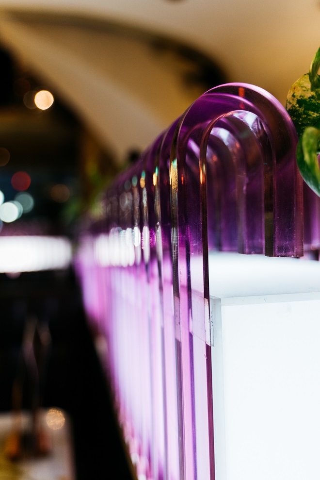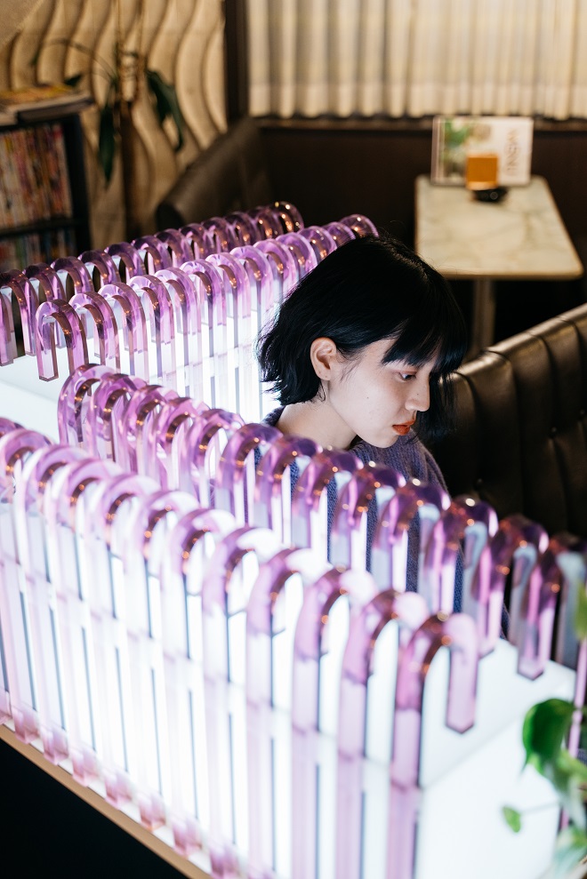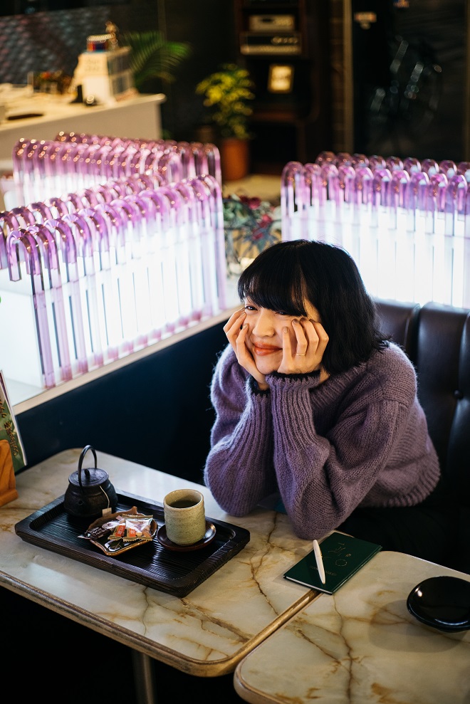 ここのお気に入りは何と言っても色。紫色の空気が優しくふわりと覆いかぶさってくる。今ではこのカーブを生み出す職人さんがもういないという紫のアクリル装飾、これが私の大本命。大好きだ。ライトに照らされ神秘的な印象がほの明るい店内で際立つ。私は今年の秋冬、紫や藤色をなぜかとても意識している。最近、季節によって色を楽しみたいという気持ちが出てきた。そんな気持ちの中、初めて意識した色が紫だった。それに気づいたときに買ったお気に入りのOSHIMA REIのニットを今日は意気揚々と着込んだ。