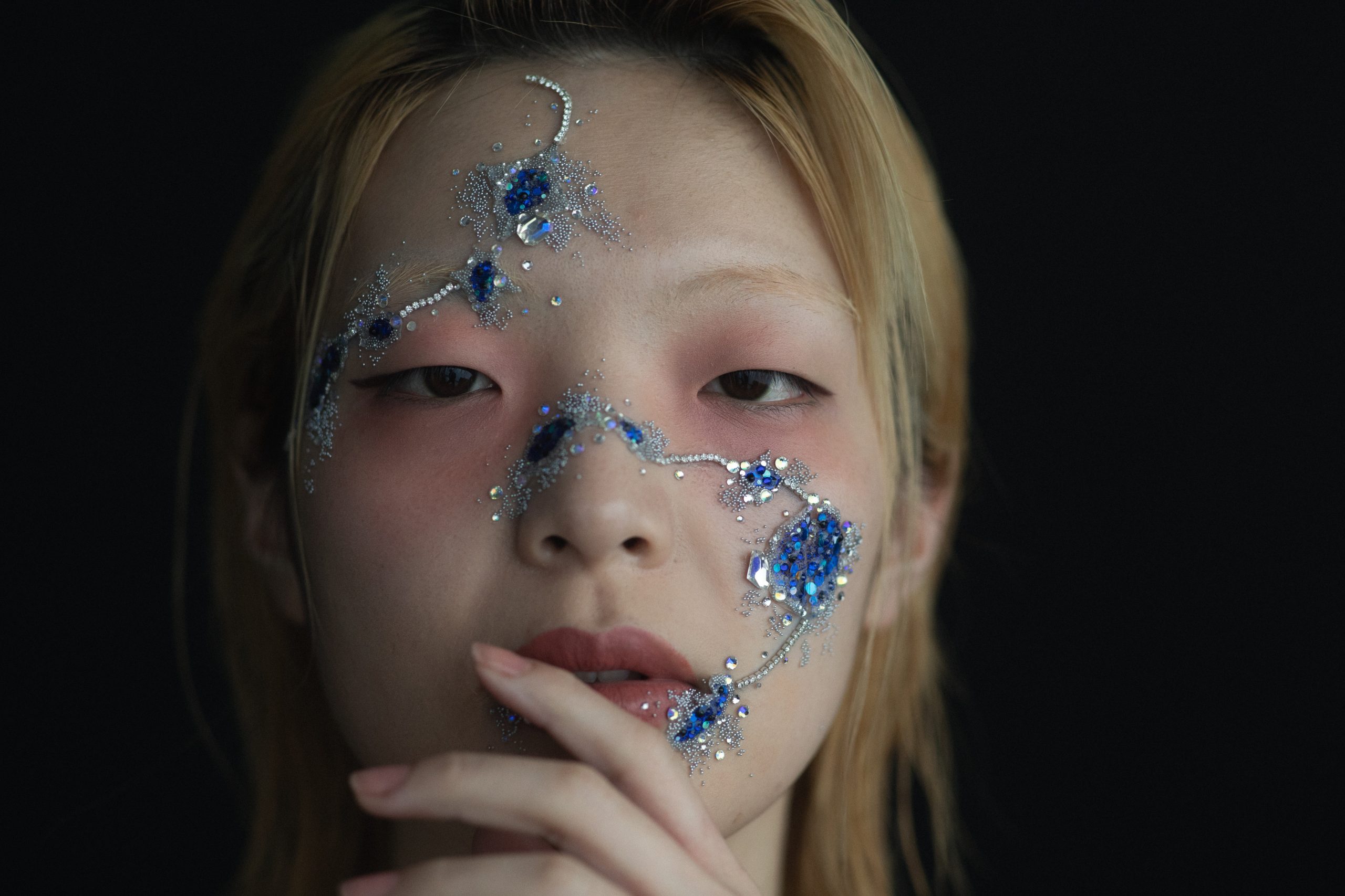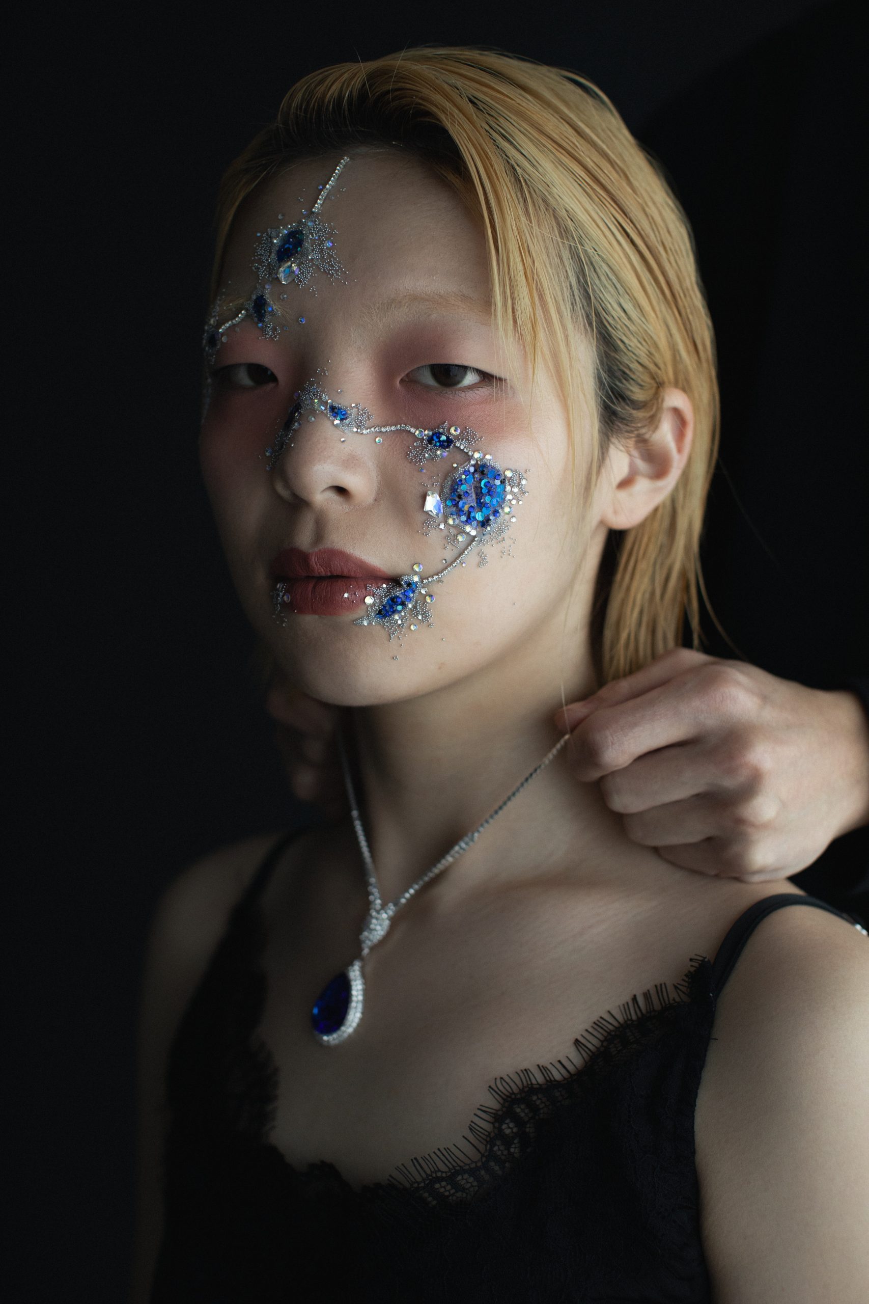 祖母から母へ、母から私へ。家族のあいだでどのように歴史を継承していくか。もどかしさを抱えて悩み、思案する姿に“美”を見出した柳田さん。疲労感をあらわした目の周辺にほのかにただようグラデーション、継承する歴史をみずからまとうようなビジューな装飾など、アーティスティックに表現しました。